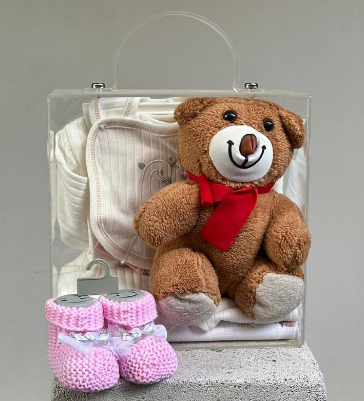Şeffaf, pleksi çanta içinde sunulan set; yumuşacık oyuncak ayı, pamuklu tekstil ürünleri ve sevimli aksesuarlarla tamamlanmıştır.