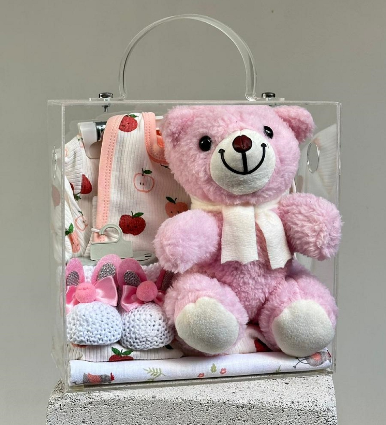 Pleksi Çantada Peluş Ayıcıklı 8’li Bebek Hediye Seti ve Battaniye – Hastane Çıkış seti