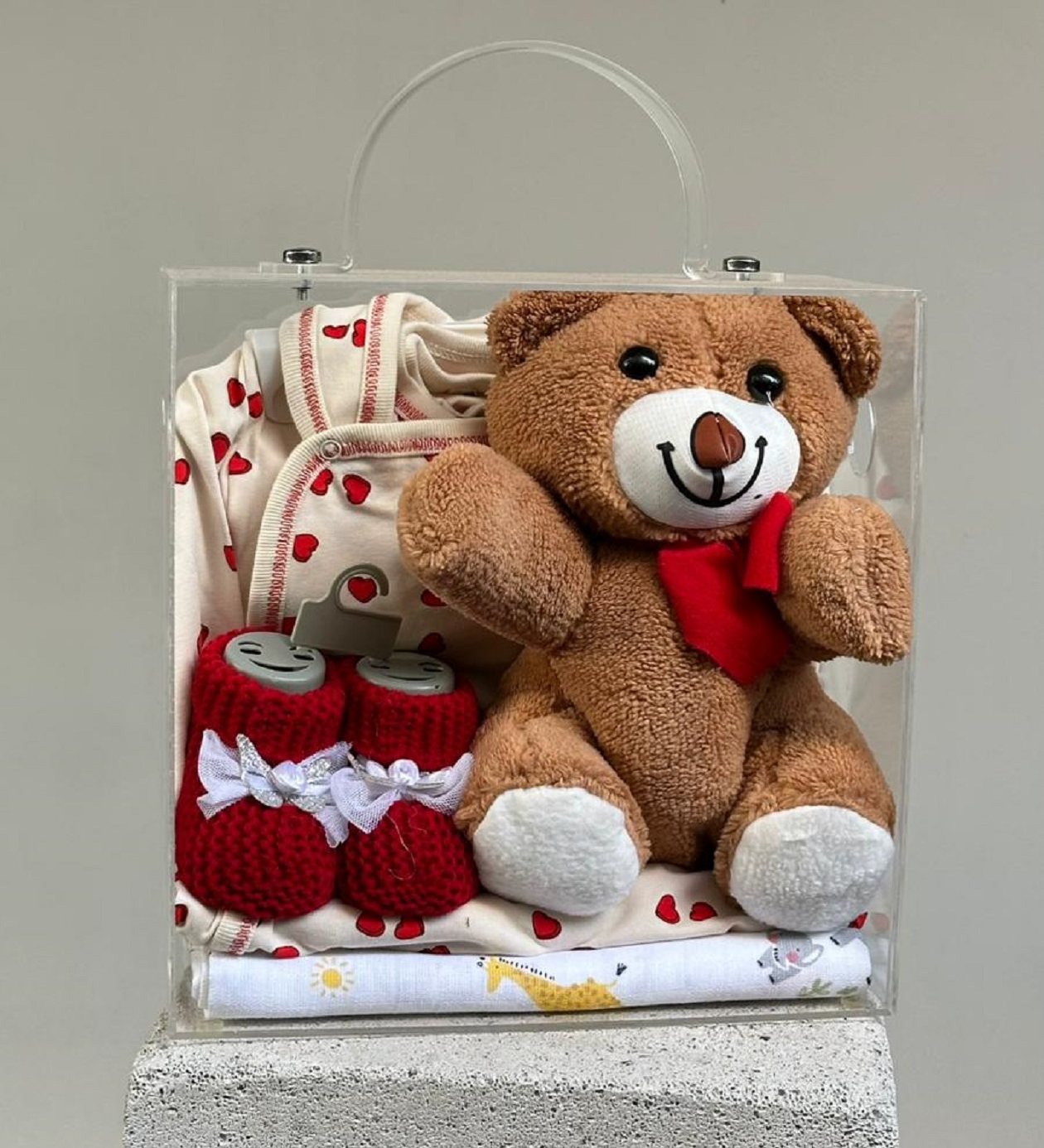Şeffaf, pleksi çanta içinde sunulan set; yumuşacık oyuncak ayı, pamuklu tekstil ürünleri ve sevimli aksesuarlarla tamamlanmıştır.